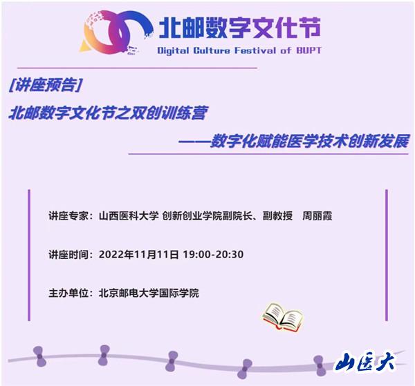 11月18日,万象城创新创业学院周丽霞副教授受邀在线上为北京邮电大学“北邮数字文化节”做了题为“数字化赋能医学技术创新发展”的专题讲座。