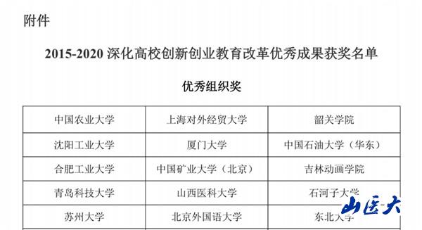 学校获评优秀组织奖,学校创新创业学院周丽霞副教授、人文学院吕雪梅讲师主编教材《医学生创新创业理论与实践》获“优秀教材”三等奖,药学院高建平教授团队项目太行潞党参——振兴革命老区的开路先锋获优秀实践三等奖,外语系杨虹讲师面向留学生开设的国际创新创业教育课程“跨文化创新思维与创业文化”(Trans-Cultural Innovation and Entrepreneurship)获优秀课程三等奖。