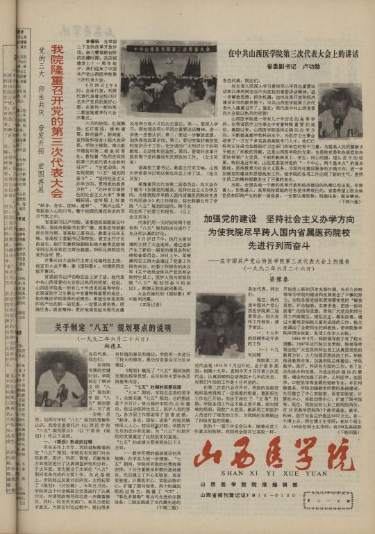 1992年6月26日至28日,中共山西医学院委员会举行第三次党员代表大会。大会参会代表共199人,其中:领导干部(含离退休)73名,各类专业技术人员90名,工人13名,学生7名。