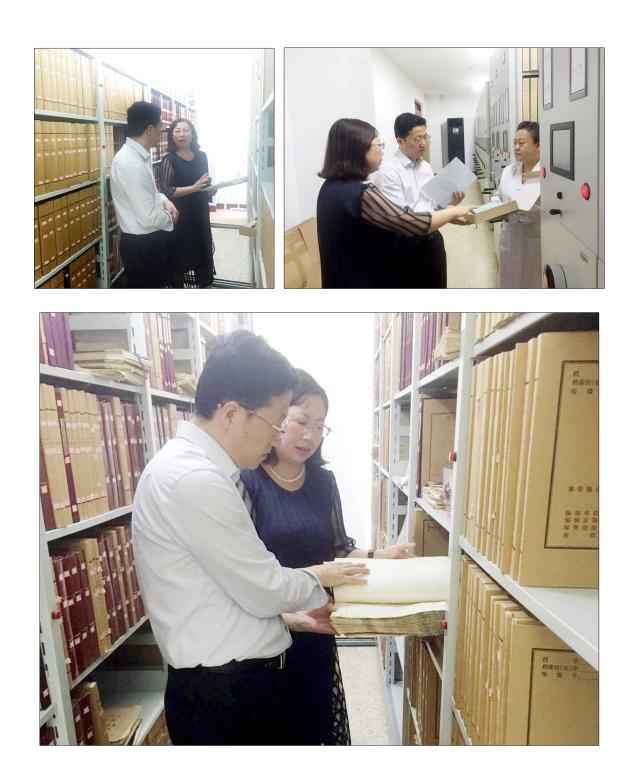 5月24日上午,王宏伟副校长来我馆调研指导工作。档案馆副馆长牛乐对王校长的到来表示欢迎,并从馆库建设、库区分布、馆藏特色、人员队伍、数字化工作前期准备等方面做了简单的介绍。王校长先后实地察看了职工人事档案、综合档案、学籍档案、学生人事档案四个档案库区和数字化加工室,并与大家进行了亲切交谈。在职工人事档案库区,王校长询问了职工人事档案的分类,工作人员通过干部人事档案管理系统演示了干部人事档案的数字化成果;在综合档案库区,牛乐副馆长向王校长具体介绍了万象城早期特色档案以及历史档案在数字化工作中的保护等问题;在学籍档案库区,王校长就学籍档案服务利用情况进行了详细了解;在学生人事档案库区,牛乐副馆长向王校长介绍了今年毕业生人事档案的前期准备情况和往年的宣讲经验;在数字化加工室,王校长询问了存量档案数字化工作结束后的场所的功能规划。