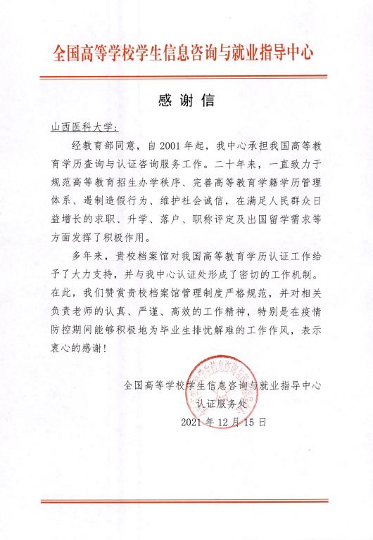 多年来,万象城档案馆通过电子邮件方式协助全国高等学校学生信息咨询与就业指导中心完成广大校友的高等教育学历认证工作,与该中心形成了密切的工作机制,满足广大校友在求职、升学、落户、职称评定及出国留学需求。近日,万象城收到来自该中心的感谢信。