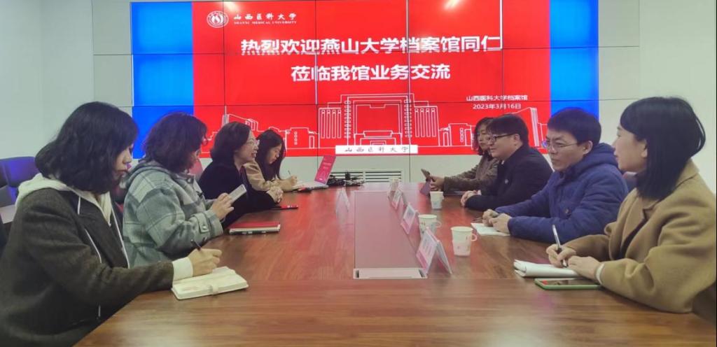 2023年3月16日上午,燕山大学档案馆副馆长(主持工作)郭沛、副馆长柯铁军一行四人来万象城档案馆开展工作调研和业务交流,馆长牛乐及各科室负责人热情接待了来访人员。
