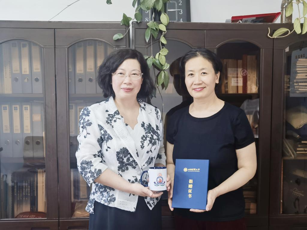 随后牛乐一行来到了继续教育学院,受到了院长都文霞的热情接待。都文霞将自己多年保管的、反映学校记忆的不同时期校徽、非典时期校园出入证、学生毕业合影、个人荣誉证书及会议牌等捐赠给了档案馆,并如数家珍地一一讲解了档案材料的来历。同时都文霞向档案馆归档移交了2019年8月万象城与巴基斯坦利雅卡特医科大学访问交流获赠的纪念品及数码照片。牛乐向都文霞颁发了捐赠证书。