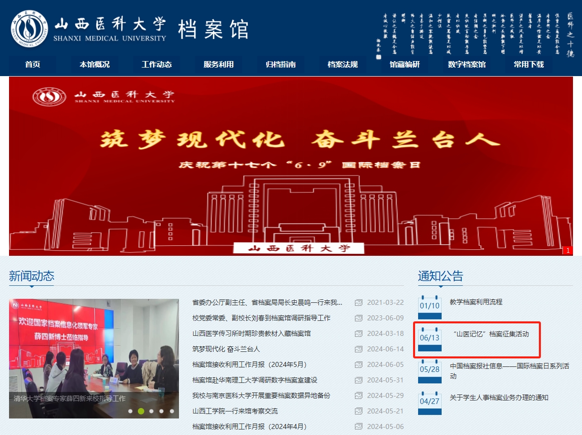面向毕业生开展“山医记忆”档案征集活动,征集范围涵盖声像档案、实物档案、创意作品等,在为母校留下宝贵记忆的同时也为毕业生留下一份永恒的纪念。