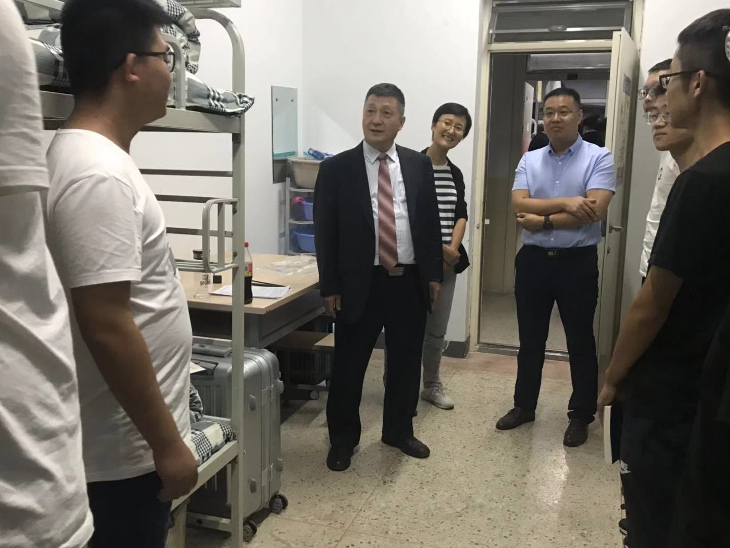 同学们围拢在院长和老师身边,你一言我一语地回答院领导的问题,把老师的谆谆教诲铭记在心。整个宿舍充满了欢声笑语。