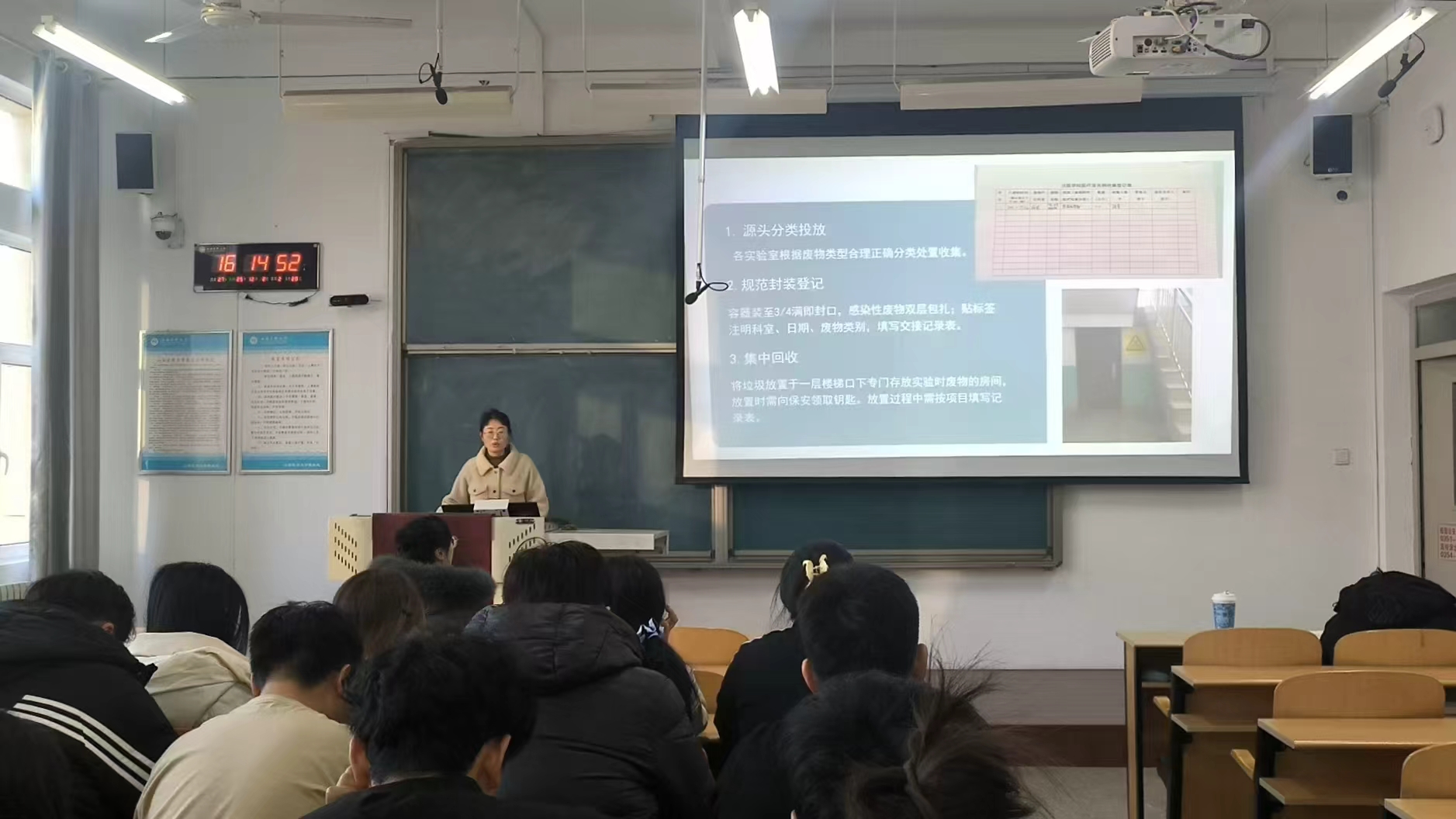 为深入贯彻落实学校实验室安全管理工作部署,切实强化研究生实验室安全规范意识与医疗废物处置能力,2025年12月2日下午,法医学院于中都校区慎思楼A座313室组织召开实验室医疗废物处置专题培训会。会议由张洁老师主持,张丹副院长主讲,全体博士、硕士研究生参加会议。