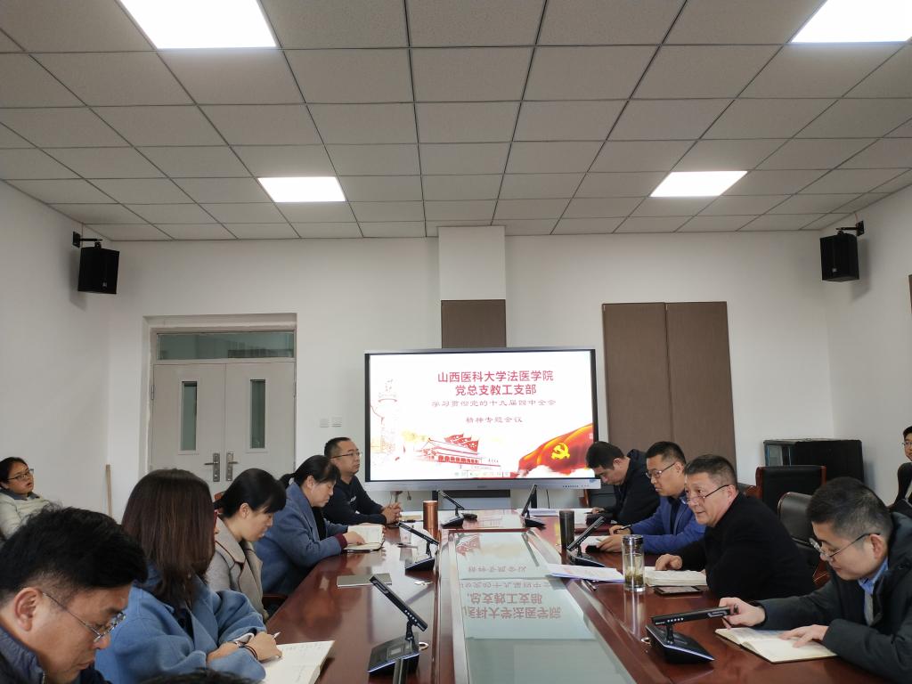2019年11月27日下午,法医学院教工党支部在法医学院会议室召开学习党的十九届四中全会精神专题会议,教工党支部26名党员参加会议,会议由教工党支部书记梁新华主持。
