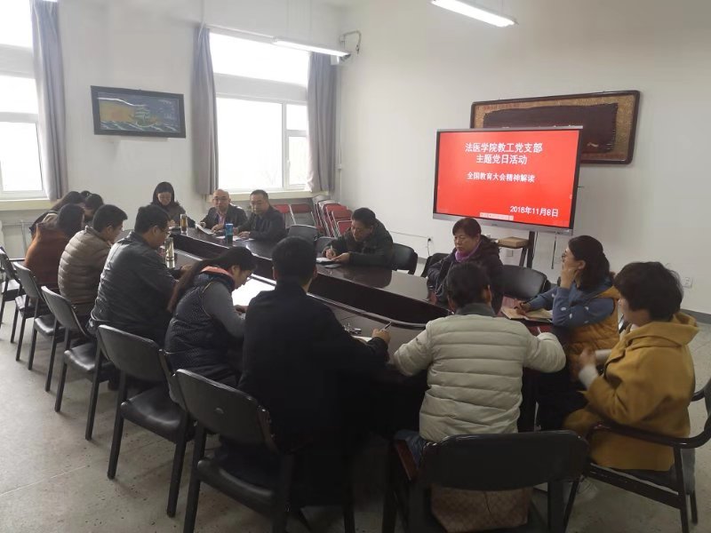 全国教育大会于今年9月10日在北京召开,中共中央总书记、国家主席、中央军委主席习近平出席会议并发表重要讲话。他强调,在党的坚强领导下,全面贯彻党的教育方针,坚持马克思主义指导地位,坚持中国特色社会主义教育发展道路,坚持社会主义办学方向,立足基本国情,遵循教育规律,坚持改革创新,以凝聚人心、完善人格、开发人力、培育人才、造福人民为工作目标,培养德智体美劳全面发展的社会主义建设者和接班人,加快推进教育现代化、建设教育强国、办好人民满意的教育。11月8日法医学院教工党支部全体党员同志学习了大会的全部内容,充分意识到党的十九大从新时代坚持和发展中国特色社会主义的战略高度,作出了优先发展教育事业、加快教育现代化、建设教育强国的重大部署的重要意义,从围绕培养什么人、怎样培养人、为谁培养人的高度结合法医学专业自身教育的特点进行充分讨论,教育引导学生树立共产主义远大理想和中国特色社会主义共同理想,增强学生的中国特色社会主义道路自信、理论自信、制度自信、文化自信,立志肩负起民族复兴的时代重任,把立德树人融入思想道德教育、文化知识教育、社会实践教育各环节。