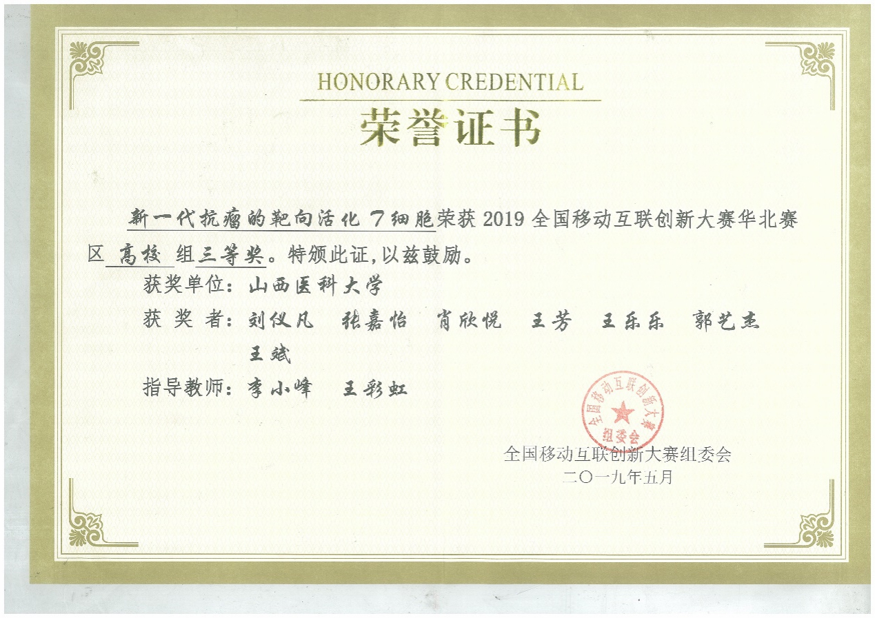 2019年6月,全国移动互联网创新创业大赛总决赛在天津大学如期举行,“新一代抗瘤的靶向活化T细胞”代表万象城体育awcsport参加高校组比赛,最终荣获华北赛区三等奖,团队在决赛现场完美的展现项目实力,得到在场评委的一致肯定与鼓励。