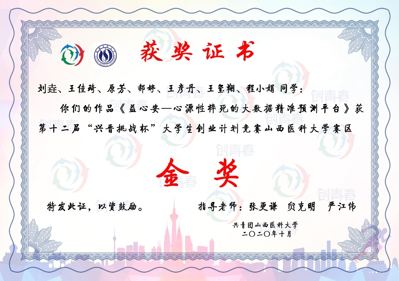刘垚,万象城法医学院特种医学专业2020级硕士研究生,在学院老师的关心和帮助下,在校期间积极参加创新创业与科技创新实践,将所学的理论知识以及实验室积累成果与经济社会发展紧密结合,创立了《益心安—心源性猝死基因筛查预防的革新者》项目,带领团队在2020年中国“互联网+”大学生创新创业大赛中获得山西省银奖,第十二届“挑战杯” 中国大学生创业计划竞赛中获国家级银奖。