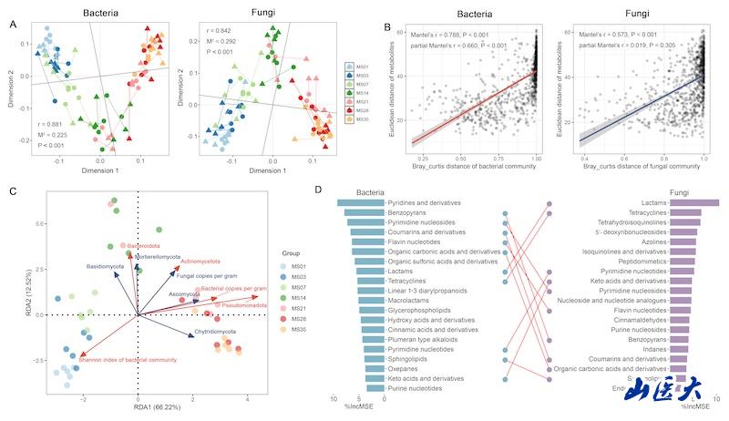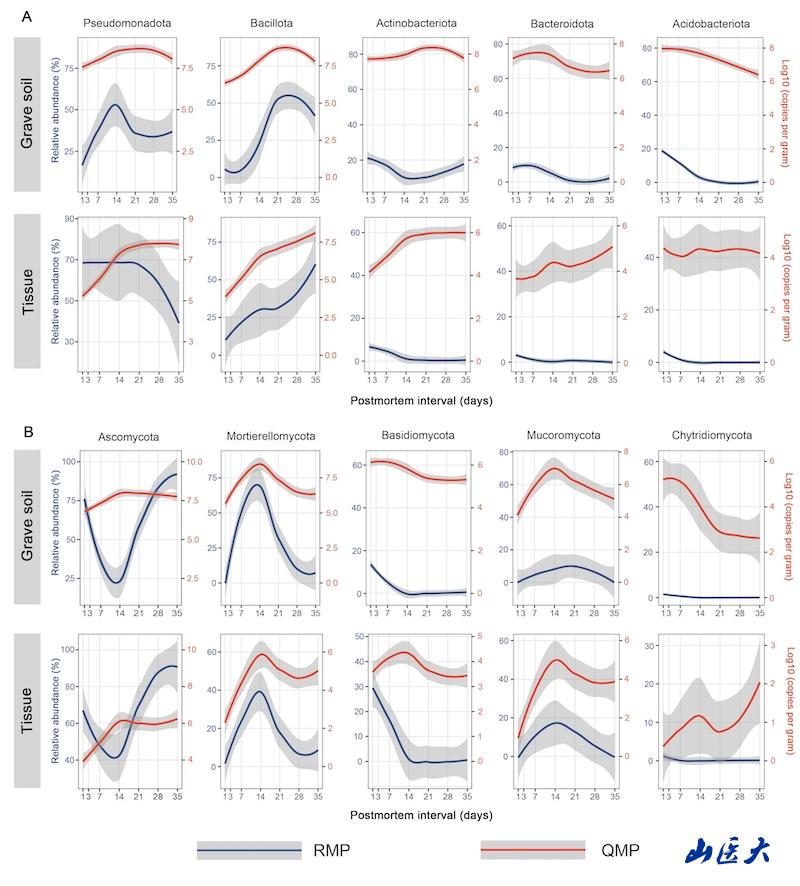 动物尸体分解腐败在地球元素循环中发挥重要作用,研究尸体腐败过程中的微生物演替对深入了解这一进程至关重要。另外,微生物群落演替可用于法医领域死亡时间的推断(PMI)。目前,对尸体微生物的表征多基于扩增子高通量测序技术,该技术仅能对微生物组成和丰度进行相对定量,忽视了微生物载量变化。严江伟教授团队首次采用微生物绝对定量技术(QMP)对大鼠尸体细菌和真菌群落进行研究。结果显示,几个主要菌门(Pseudomonadota、Actinobacteriota、Bacteroidota、Ascomycota和Basidiomycota)的绝对丰度表现出与相对丰度截然不同甚至相反的变化趋势,表明相对定量技术在表征群落演替时存在偏差,容易忽略某些微生物类群在腐败进程中发挥的作用。