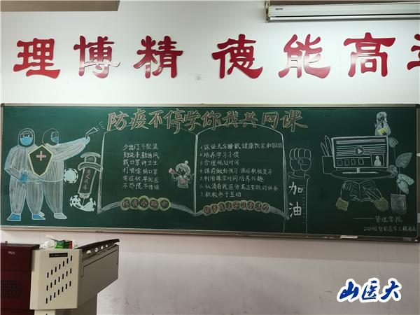 为营造疫情防控常态化背景下健康有序的教学氛围,引导同学端正学习态度,保证网络教学质量,日前管理学院举办了“防疫不停学、你我共网课”主题黑板报展示活动。