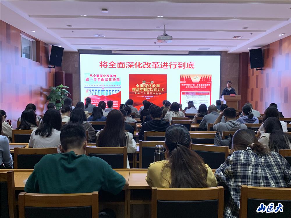 9月25日下午,管理学院和图书馆联合举行学习贯彻党的二十届三中全会专题宣讲报告会,邀请了校宣讲团成员、马克思主义学院中国近现代史纲要教研室副主任薛东老师作专题宣讲,两个单位全体教职工和管理学院的学生党员、入党积极分子和学生代表参加宣讲报告会。图书馆馆长袁永旭主持会议。