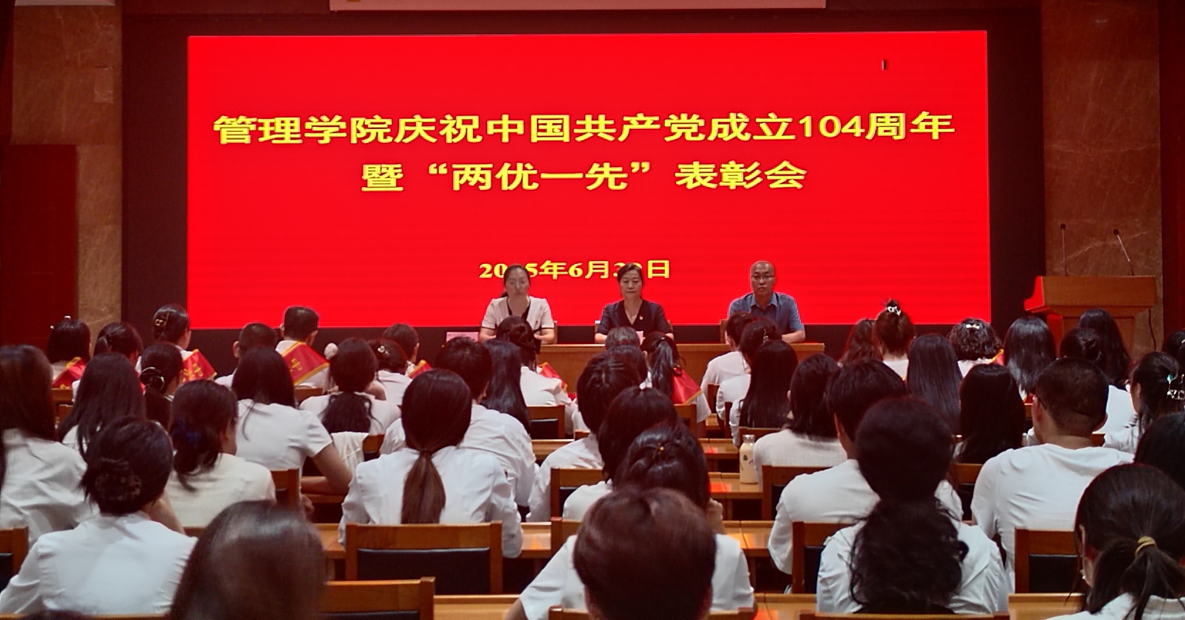 为庆祝中国共产党成立104周年,激励学院师生党员坚定理想信念、加强党性修养、改进工作作风,不断增强基层党组织凝聚力和战斗力,6月30日下午,管理学院党委在图书馆报告厅隆重举行庆祝中国共产党成立104周年暨“两优一先”表彰大会。学院党委委员、各党支部支部书记、全体教工党员和学生党员代表参加表彰会,会议由党委副书记乔晓梅主持。