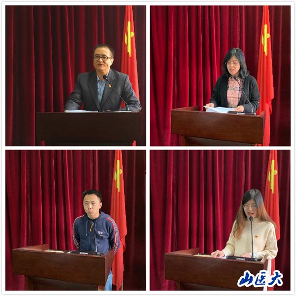 教工第四党支部书记宗苏秋从高等学校教师以德立身、以身立教、以才育人、以爱化人的方面分享自己的体会,要甘当人梯,甘当铺路石,成为塑造学生品格、品行、品味的“大先生”。学生第四党支部书记何小峰结合自身经历,分享了如何在教书育人过程中引导学生正确的思想方向、培养爱国主义精神、传播优秀传统文化、树立担当意识和养成良好学习习惯,培养德才兼备的社会主义建设者和接班人。学生第三党支部党员席芳洁围绕主题教育“守初心、担使命、找差距、抓落实”的总要求,汇报了自己在学习、协助老师工作、社会实践、科学研究等方面的现实表现,深刻剖析了存在的问题和不足,为今后的努力指明了方向。