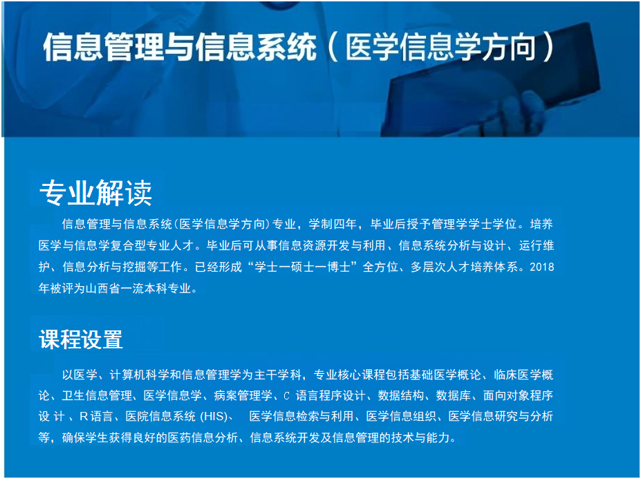 学习成绩优异的学生在第四学年可向学校申请推荐优秀应届本科毕业生免试攻读研究生资格,所有毕业生均可以参加全国硕士研究生统一招生考试,继续攻读硕士学位研究生;就业可到各级医疗卫生机构、卫生行政部门、医药及信息技术企业等从事信息相关工作。