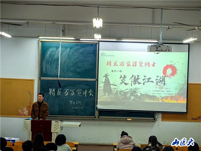 11月6日,管理学院在中都校区举办“北京精医万家”校招专场宣讲会,精医万家人力资源执行总监李玖和老师受邀宣讲,学院党委副书记乔晓梅,思想政治辅导员岳红娟以及2025届和2026届部分学生参会。