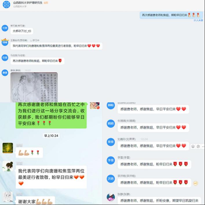 此次主题班会同学们受益匪浅,会议结束后,辅导员代表同学们向唐珊老师和焦雪萍两位最美逆行者致敬,希望他们能够早日归来。同学们也纷纷为两位老师发出祝福,希望他们能够在防疫的前方做好自身防护,保重身体,我们在后方做她们坚实的后盾,期盼安康,期待能够与她们早日相聚,一起学习,一起工作。当君归来时,便是花开日!希望自己今后能够立足临床实际,踏实科研步伐,秉承爱心仁术的精神内涵为护理事业奋斗终身,为祖国贡献自身力量!