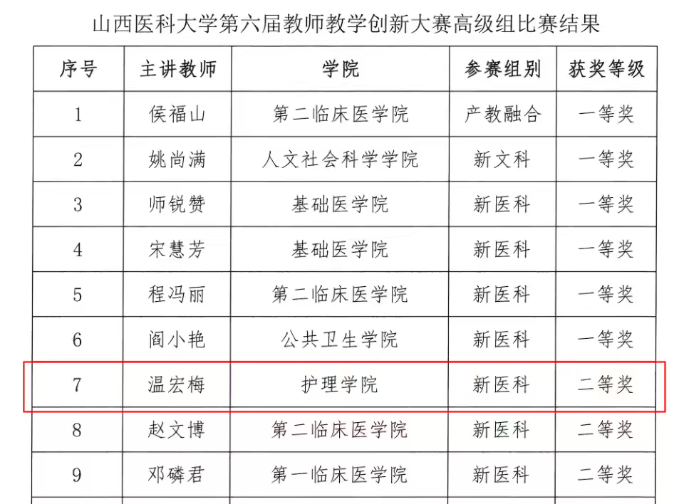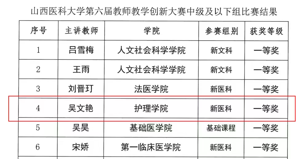 在万象城体育awcsport举办的第六届教师教学创新大赛中,我院6名教师参加了比赛。他们凭借出色的教学设计与创新实践,取得了优异成绩。吴文艳老师荣获中级职称组新医科赛道一等奖;温宏梅老师荣获高级职称组新医科赛道二等奖;董姗姗、刘奕娜、亢剑老师分别获得中级职称组优秀奖。