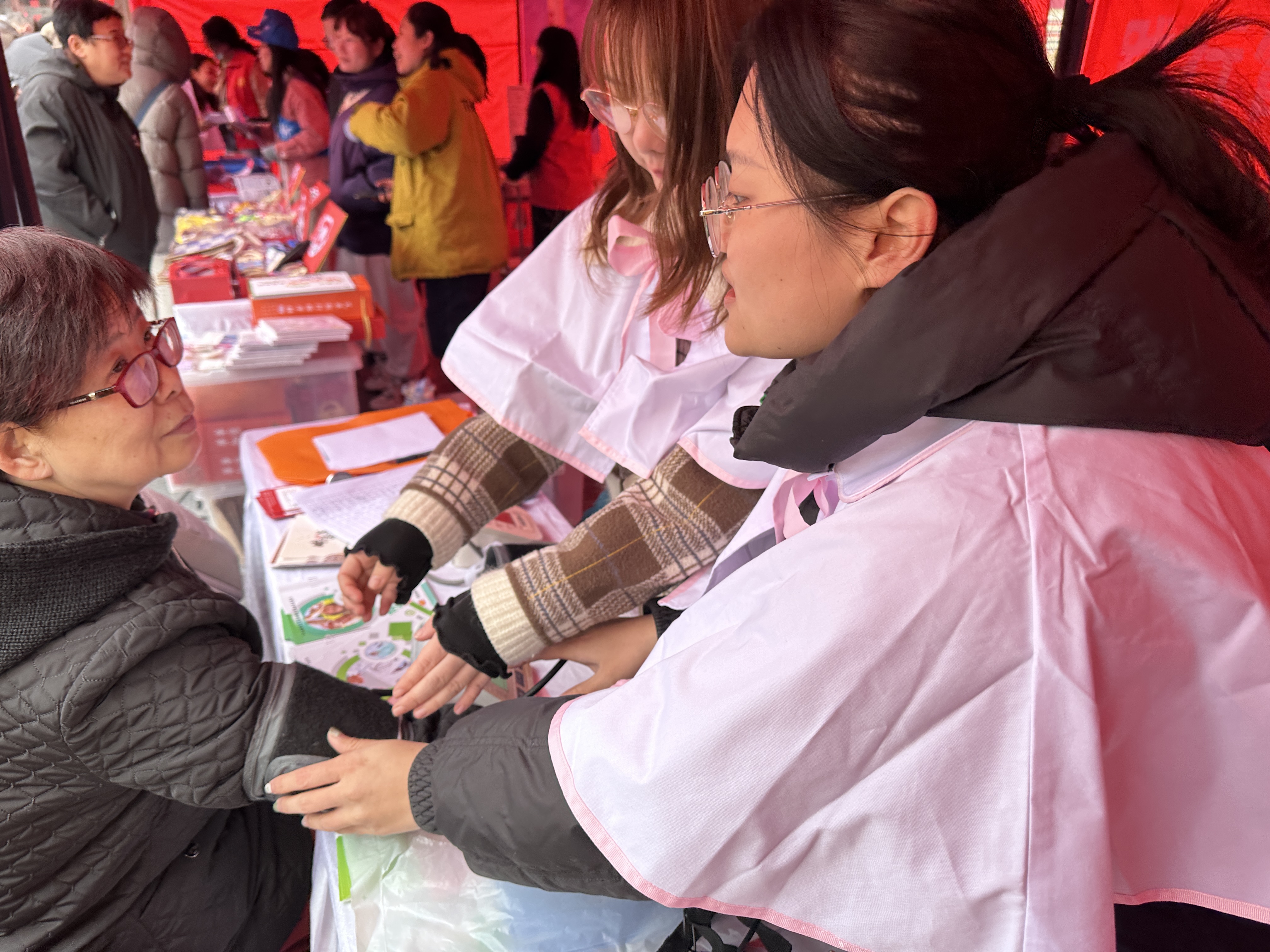 活动当天,志愿者们热情高涨,早早来到现场,与社区工作人员一同布置场地。看到往来居民好奇又期待的眼神,志愿者们迫不及待想要开展服务。活动开始,志愿者重点介绍坝陵桥社区医院的“暖心便民”护理签约服务包,针对居民关心的费用、服务时间、医护资质等问题耐心解答。在宣传国家基本公共卫生免费服务项目和家庭医生签约服务时,志愿者发现居民了解有限,便结合实例通俗易懂地讲解。急救护理措施宣传环节,志愿者用模拟人演示心肺复苏胸外按压,讲解细节并鼓励居民体验。社区老师把脉问诊时,志愿者主动为患者量血压,记录数据,讲解健康知识,提醒血压偏高者注意事项,收获患者信任与感激 。