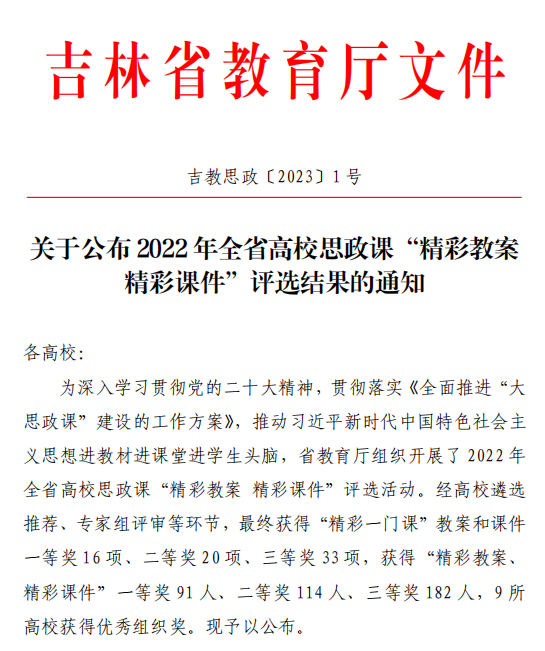 【JAI·赛】潜心耕耘,硕果飘香——马克思主义学院在全省高校思政课“精彩教案 精彩课件”比赛中喜获佳绩 发布时间:2023年01月13日 15:23:00 浏览:次 吉林省教育厅组织开展的2022年全省高校思政课“精彩教案 精彩课件”评选结果近日揭晓,欧博abg游戏登录入口荣获团队及个人共计8个大奖: 其中王金老师的教案和课件获“精彩教案 精彩课件”类别一等奖;张绍珂、王金、蒋乔欣、陈杨组成团队的“毛泽东思想和中国特色社会主义理论体系概论”课获得“精彩一门课”类别二等奖;刘越、孙建峰、董金芳、张绍珂、朱浩、曹丽丽六位教师的教案和课件获得“精彩教案 精彩课件”三等奖。 一、“精彩一门课”获奖
