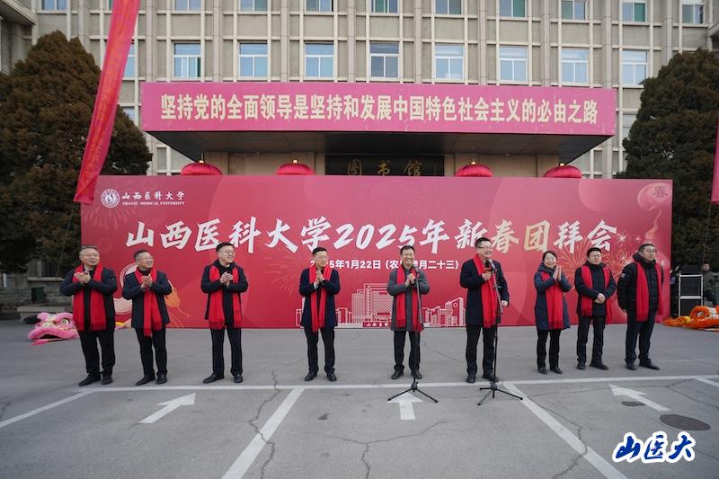 王军代表学校党政,向为学校发展作出重要贡献的老同志、勤勉敬业的教职医护员工、笃志好学的山医学子以及关心和支持学校发展的广大校友和各界朋友致以节日问候和新春祝福。他指出,2024年,学校坚持不懈用习近平新时代中国特色社会主义思想凝心铸魂,深入学习贯彻党的二十大和党的二十届二中、三中全会精神,扎实推进党纪学习教育走深走实,坚决扛起“双一流”创建使命,牢牢把握山西高等教育“百亿工程”重大机遇,齐心协力绘就发展新图景。“红石榴”工作室被中共中央、国务院授予“全国民族团结进步模范集体”。获赠学校百年华诞日在天安门广场升起的国旗。ESI全球排名前1%学科由3个增至6个。特种医学蝉联全国第一。联合华大在全国首开《智能生物计算》前沿课程,进入“全国教学创新强校TOP100”前40。国家重点研发计划重大专项单项经费达历史新高。首次获批国家基金委海外优青项目。成为全国首家获批国家原子能机构核技术研发中心的高校。入选《2024年中国内地高校顶刊发文年鉴》顶刊成果Top100高校。反向病原学徐建国院士工作站、“科技外交官之家”山西站落户学校。师生医护学习、工作和生活环境持续改善。