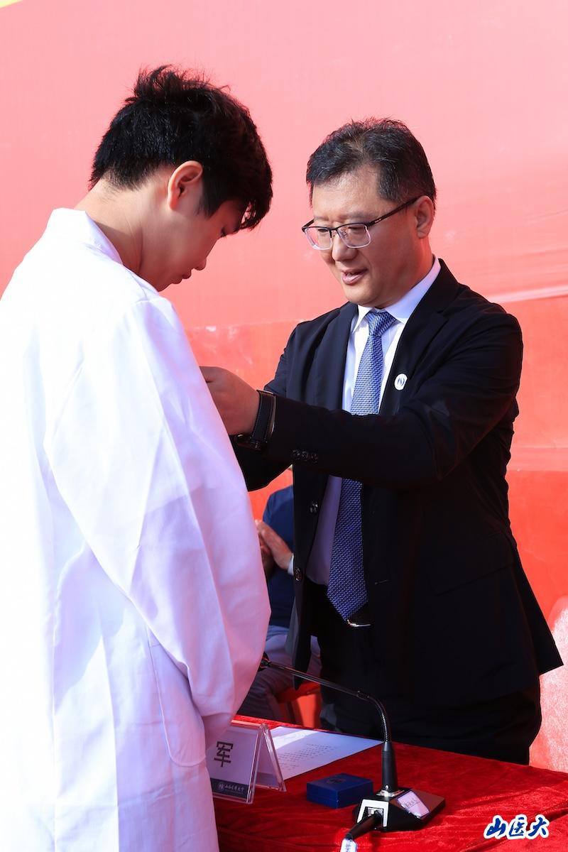 校徽承载着山医的荣耀与使命,蕴含着深深的祝福与殷切的希望。校领导、嘉宾们为2025级新生代表佩戴校徽,点燃同学们心中的归属感与自豪感。全体新生与思想政治辅导员相互致礼。这一仪式不仅是礼貌的表达和文化的传承,更是师生情谊的真诚交融。