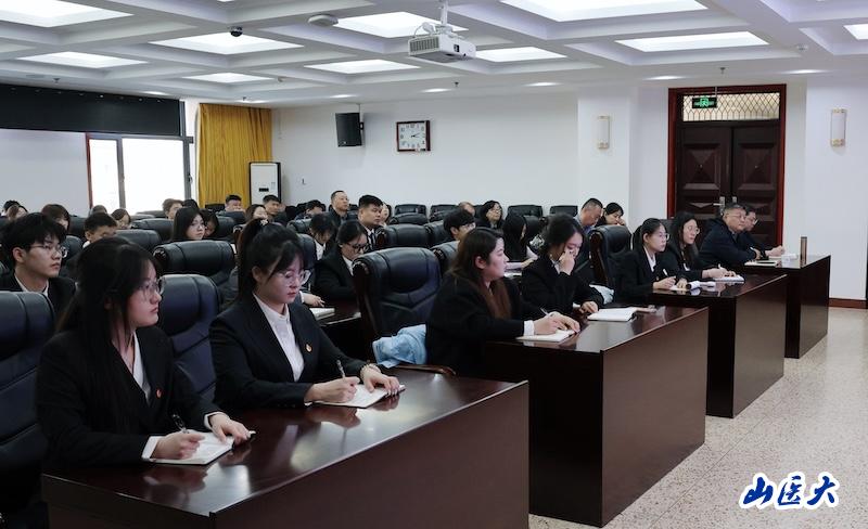 王军以《深入学习贯彻党的二十届四中全会精神 在中国式现代化建设中书写青春华章》为题,围绕深入学习贯彻党的二十届四中全会精神和习近平总书记五次考察山西重要讲话重要指示精神,结合省委十二届十一次全会精神和学校高质量发展主题,从“深入学习领会全会精神入手,切实把思想和行动统一到党中央决策部署上来”“深刻领悟习近平总书记重要讲话重要指示精神,明晰山西发展使命担当”“以党的二十届四中全会精神为指引,奋进学校高质量发展新征程”“锤炼过硬本领,在奋力谱写三晋大地推进中国式现代化新篇章中绽放青春光华”四个方面,对全会精神进行了系统阐释、深入解读和全面宣讲。