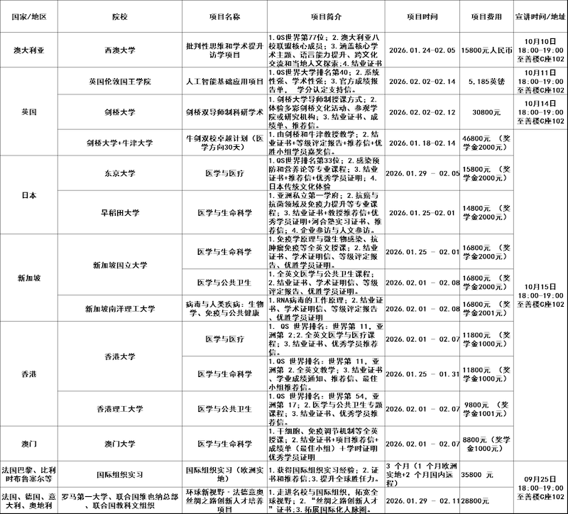 为深入推进人才培养模式改革,加快培养国际化高素质人才,根据学校相关政策,现将报名2026年寒假出国(境)短期线下访学项目通知如下: