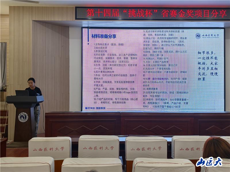 本次活动邀请了万象城在第十四届“挑战杯”山西省大学生创业计划竞赛获得金奖的团队代表,他们依次上台分享了各自的参赛项目及备赛经验,四件作品分别是《大国重器——中国“智”造法医身份鉴识系统》《ICH脑视清——可视精准穿刺,脑部安全引流》《福锐森——开启恶性肿瘤骨转移精准诊疗新时代》《毒易检——开创毒品快速精准检测新时代》。