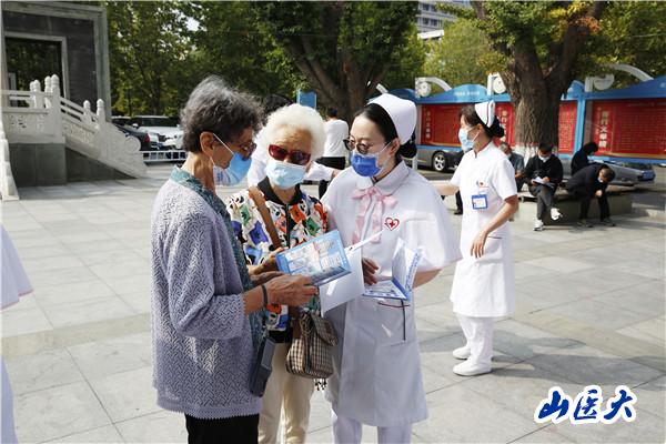 活动首日的护理科普宣传主题为“防灾减灾”“疫情防控”,活动地点在1号住院楼前广场。护理部组织护理人员开展了宣讲、示范、指导、义诊等活动。10名南丁格尔志愿者和6名团委志愿者协助活动顺利开展。