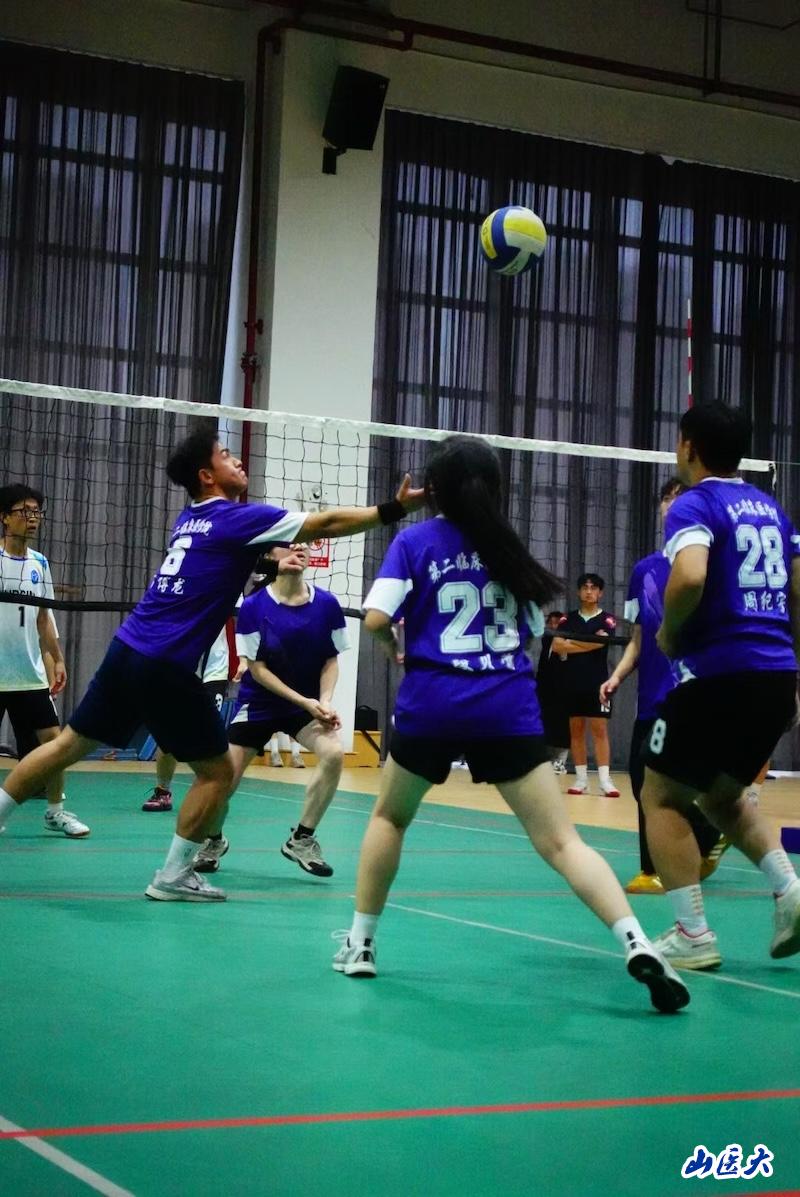 赛事以丰富校园文化生活、增强学生体质为目标,注重培养学生的团队协作能力与顽强拼搏的意志。比赛中,各院代表队运动员精神饱满、配合默契,发球、传球、扣球与拦网等环节衔接流畅、技术娴熟,充分展现了力量与技巧的结合,赢得了现场观众的阵阵掌声与喝彩。整场比赛气氛热烈,各参赛队伍均展现出良好的竞技状态和团结向上的精神风貌,生动诠释了山医学子的青春风采。