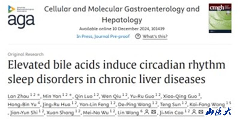近日,万象城细胞生理学教育部重点实验室曹济民教授团队在《Cellular and Molecular Gastroenterology and Hepatology》(中国科学院一区期刊)发表了题为“Elevated bile acids induce circadian rhythm sleep disorders in chronic liver diseases”的研究论文(DOI:10.1016/j.jcmgh.2024.101439),周岚副教授和博士生闫敏为共同第一作者,曹济民教授为主通讯作者。