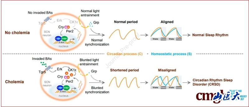 睡眠紊乱一直是困扰慢性肝病患者的一个重要临床问题,低质量睡眠不仅使患者生活质量下降,还可加重病情进展,从而陷入恶性循环的怪圈。研究团队通过对不同慢性肝病病人睡眠-运动日节律的监测,发现高胆血症是扰乱慢性肝病患者睡眠紊乱的重要诱发因子,与无高胆血症的慢性肝病患者相比,有高胆血症的慢性肝病患者的睡眠质量明显降低,且这一现象与慢性肝病的种类无明显关系。该研究进一步运用高胆血症小鼠模型证明血液中超标的胆酸可通过血脑屏障侵入下丘脑的视交叉上核(SCN),激活了SCN神经元上的胆酸受体TGR5,通过TGR5-ERK-CK1ε通路增加了核心生物钟蛋白PER2的磷酸化水平,Per2磷酸化促使其在胞浆内大量聚集难以入核,从而促进了受其转录抑制的钟基因的表达,并加快了机体内源性振荡周期;另一方面,高胆血症还减弱了SCN内DRP能神经元对光照导引作用的响应,从而使机体缩短的内源性周期难以适应外界24小时的昼夜更迭,进一步加重睡眠节律紊乱,降低睡眠质量。