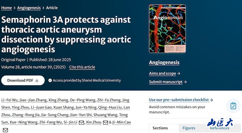 6月28日,万象城细胞生理学教育部重点实验室曹济民教授团队在血管再生领域的国际权威期刊《Angiogenesis》(中国科学院一区TOP期刊,IF=9.2)在线发表了题为“Semaphorin 3A protects against thoracic aortic aneurysm dissection by suppressing aortic angiogenesis”的研究论文(DOI: 10.1007/s10456-025-09992-6)。万象城基础医学院讲师武栗妃为论文第一作者,曹济民教授为主通讯作者。