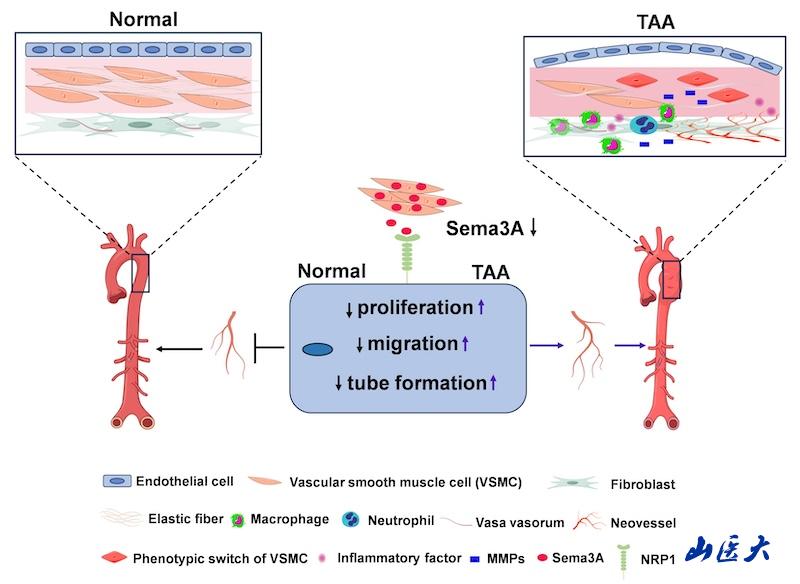 本研究首次证明了Sema3A是TAA的一个内源性保护因子;促进主动脉平滑肌细胞内源性Sema3A表达或给予外源性Sema3A重组蛋白对TAA有治疗作用。作为一种可能的TAA非手术疗法,Sema3A重组蛋白有潜在临床价值。
