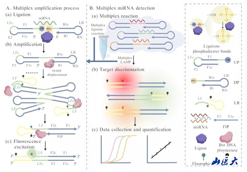 miRNA作为一类小非编码RNA分子,已被广泛应用于肿瘤早期筛查、疾病进展监测及治疗等生物医学实践中。相比单一指标检测,多重miRNA同步定量分析有助于提升检测结果的准确性。尽管目前基于PCR的miRNA检测技术已较为成熟,但其在特异性和灵敏度方面仍存在一定局限,难以满足液体活检、无创产前诊断及法医微量降解样本检测等高要求应用场景。环介导等温扩增(loop-mediated isothermal amplification, LAMP)虽具备更高的扩增效率及灵敏度,但其对模板长度的严格要求使其难以直接适配短小的成熟miRNA,更无法支持多重miRNA靶标的同时识别与定量。
