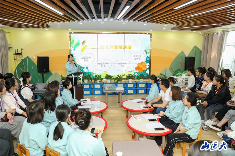 园长宋丽对教研员们的到来表示热烈欢迎并介绍了幼儿园的基本情况。教研员们跟随讲解老师深入教室、户外,观摩了幼儿园环境、STEAM科创空间、科学发现室、幼儿区域及户外活动。幼儿园的每一处都蕴含着“以儿童为本”的教育思想,园史墙前,教研员们驻足聆听,不时提问和交流,对山医幼荣光七十四载纷纷点头称赞。经过一个小时的观摩,教研员们对幼儿园以儿童为本,鼓励自主探索的教育理念给予高度评价,认为幼儿园的办园理念和课程理念既符合幼儿的年龄特点,又有效促进孩子们全面发展。