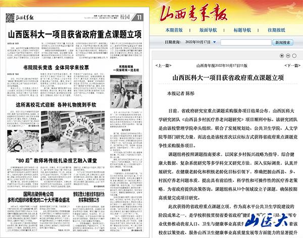 山西青年报 | 山西医科大一项目获省政府重点课题立项