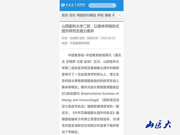 中国教育报-中国教育新闻网讯(通讯员 任晓辉 记者 赵岩)近日,万象城体育awcsport第二临床医学院耳鼻咽喉头颈外科教研室举行了一次由首席学科带头人、博士生导师赵长青教授课题组组织的研究生线上集体审稿会。稿件为赵长青教授课题组应SCI收录期刊《International Archives of Allergy and Immunology》(国际变态反应与免疫学杂志)编辑部邀请受审的一篇论文。《中华耳鼻咽喉头颈外科杂志》编辑部副编审方祎博士受邀全程指导,20余名科室在读研究生和部分科室骨干教师参加了审稿会。
