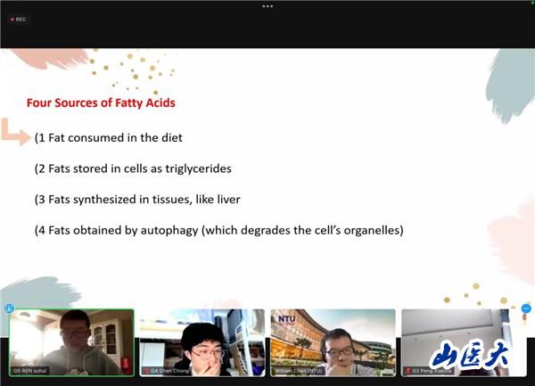 小组结业汇报中,任胥晖同学分享了关于“脂肪酸代谢途经与如何抑制脂肪酸过度累积”的学习收获,获得了小组评价中的最高分。冯君杰同学以“基于对生物化学的理解,定义脂肪酸产生的能量”为课题方向,参与小组汇报并得到教授好评。