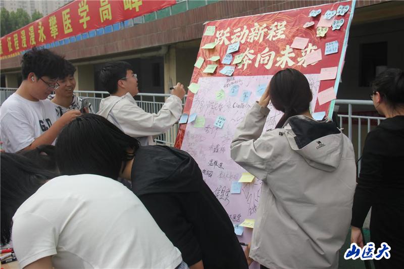 新生们在展板上留言,相互勉励尽快适应新环境、奋勇前行,期许自己在新学期坚守初心、笃行不怠,尽显对未来求学之路的坚定与热忱。