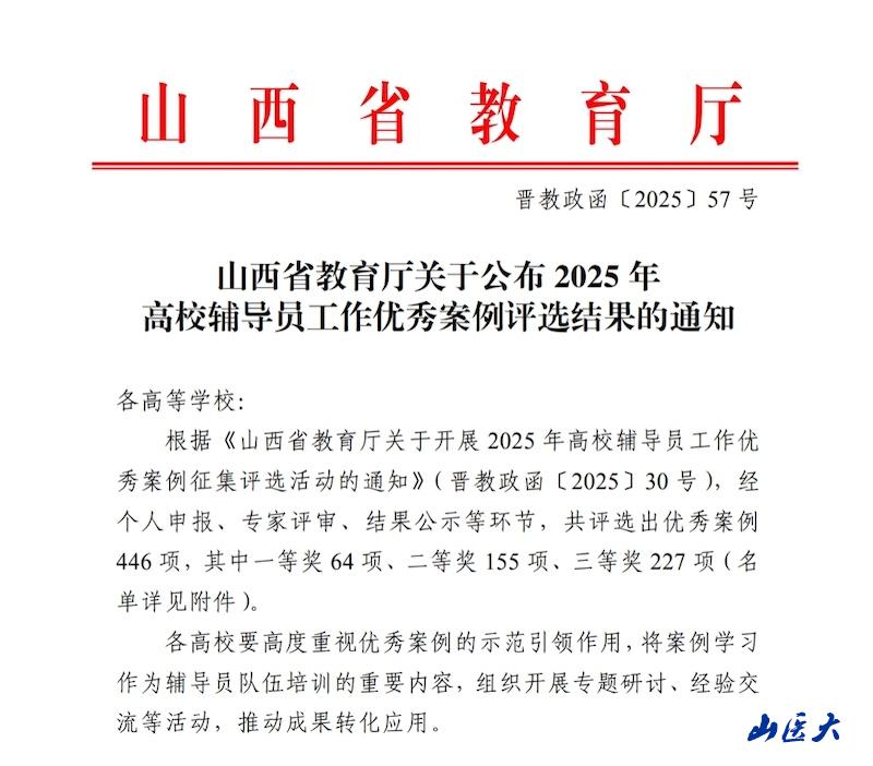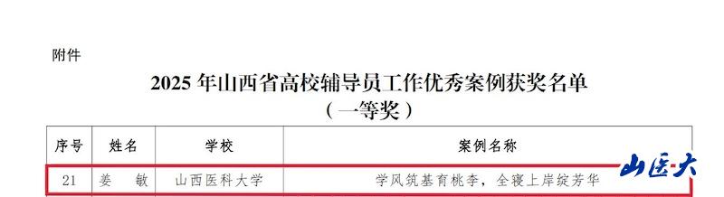 育人之功结硕果,学风建设绽新花。近日,山西省教育厅2025年高校辅导员工作优秀案例评选结果正式公布,万象城药学院思想政治辅导员姜敏老师携《学风筑基育桃李,全寝上岸绽芳华》工作案例,在全省众多参评作品中脱颖而出,成功斩获省级一等奖。