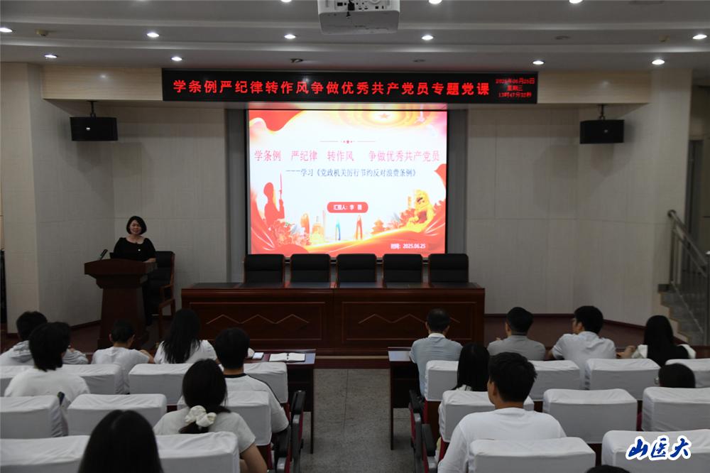 6月25日,药学院党委在中都校区明德楼报告厅开展深入贯彻中央八项规定精神学习教育专题党课。学院党委书记李薇以“学条例 严纪律 转作风 争做优秀共产党员”为题,为党支部书记、辅导员、师生党员代表授课。