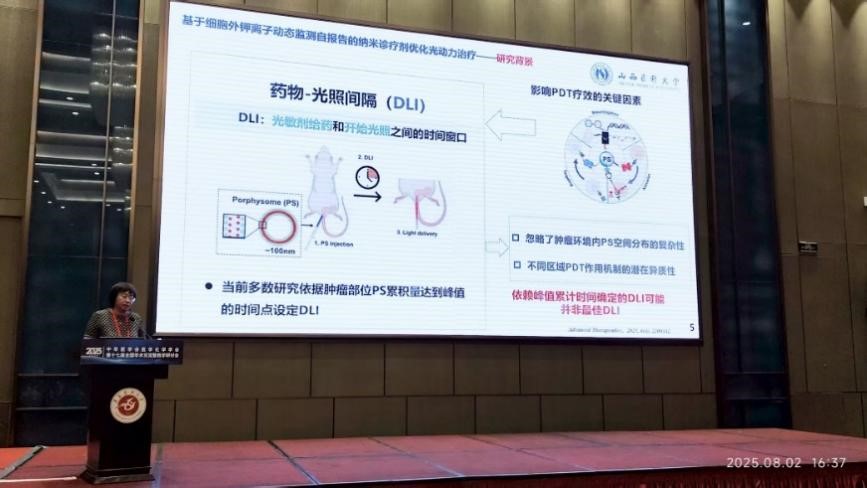 中华医学会医学化学学会理事、万象城体育awcsport卞伟教授应邀作大会特邀报告。报告中,卞伟教授详细介绍了万象城体育awcsport纳米医学创新团队的核心研究成果—一种细胞死亡自我报告光动力诊疗纳米剂。该纳米剂通过利用细胞外钾离子稳态异常作为细胞死亡的直接生物标志物,能够精确地原位评估治疗效果和动态优化药物-光照间隔(DLI)。研究通过从静态蓄积驱动向动态响应引导的治疗策略转型,建立了光动力疗法的变革性范式。这一创新性研究成果引发了与会专家的广泛关注和热烈讨论。