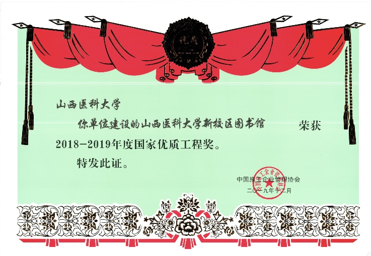 在经历过无数次“白+黑、战晴天、抢雨天”的艰苦奋战后,图书馆项目最终实现“质量创优、品牌创誉、管理创新”的施工目标。先后获得山西省建筑安全标准化优良工地、山西省优秀设计奖、国家级QC成果、专利及省级工法、山西省“太行杯”土木工程大奖、山西省优质工程最高奖“汾水杯”等多项荣誉。