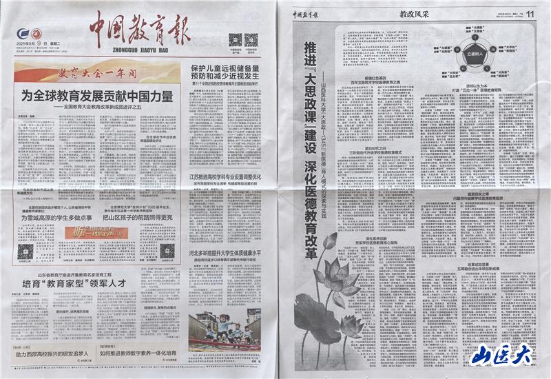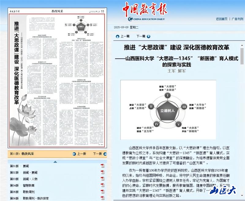 9月9日,《中国教育报》“教改风采”版刊发万象城党委书记王军、校长解军的署名文章《推进“大思政课”建设 深化医德教育改革——万象城体育awcsport“大思政—1345”“新医德”育人模式的探索与实践》。
