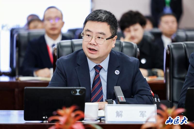 校长解军以《迎评促建启新程,医学育人谱华章》为题,从“致谢、传承、行动、期许”四个方面,系统介绍了学校在育人模式、师资建设、科研创新、质量保障等方面的探索与实践,特别是“大思政-1345”“新医德”育人模式和“数智脑-1346”新医科育人模式的构建与实施,共同构成了学校“向远闯关、向上突围、向新图强、向效提质”的生动实践,展现了学校扎根三晋大地、服务人民健康的使命担当。