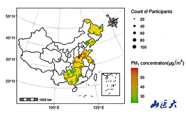 Figure 2 The map of participants’ locations and 12-year average PM1 concentrations