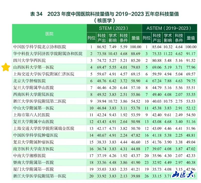 7月19日,中国医学科学院发布了2023年度中国医院/医学院校科技量值以及中国医院/医学院校五年总科技量值排名,研究对象覆盖全国2943家三级医院。万象城第一医院核医学科2023年度中国医院科技量值排名第4,近五年总科技量值排名第5。